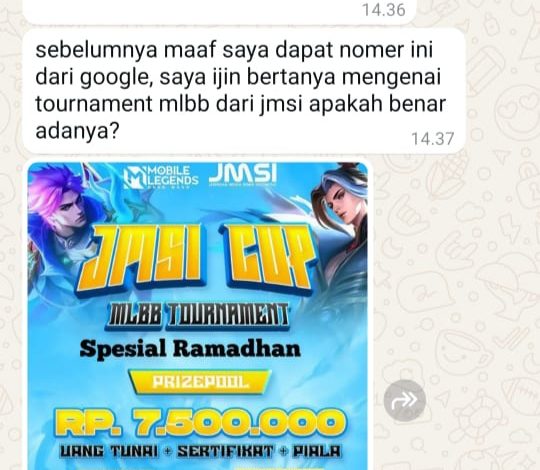 Lampung Selatan – Beredar pesan si aplikasi WhatsApp (WA), JMSI Lampung Selatan mengelar turnamen Mobile Legends.