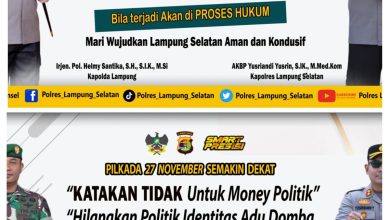 Lampung Selatan – Kapolres Lampung Selatan (Lamsel), AKBP Yusriandi Yusrin membuat himbauan ke masyarakat terkait pemilihan kepala daerah (Pilkada) damai…