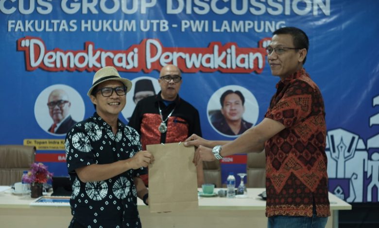 Bandar Lampung -Fakultas Hukum Universitas Tulang Bawang (UTB) menggandeng Persatuan Wartawan Indonesia (PWI) Lampung sukses menyelenggarakan Focus Group Discussion (FGD) bertema “Demokrasi Perwakilan” di Balai Wartawan H. Solfan Akhmad Jumat (20/12/2024).