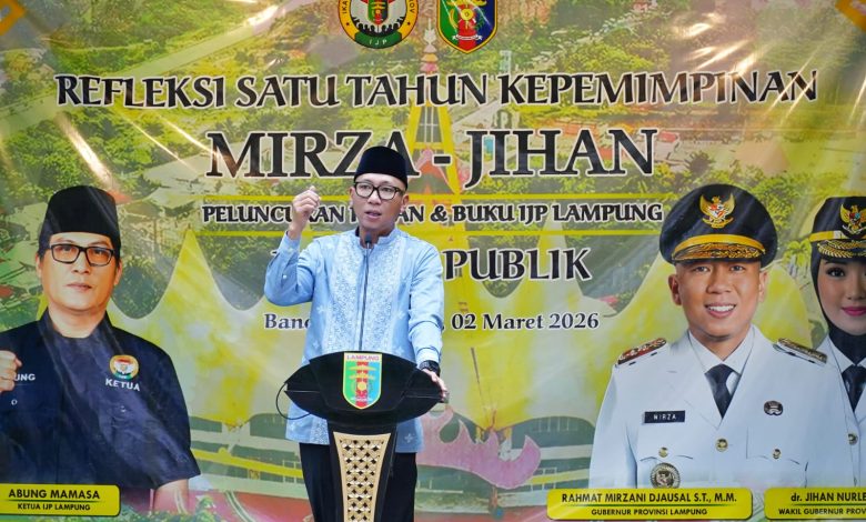Hal tersebut disampaikan saat Peluncuran Koran Ikatan Jurnalis Provinsi (IJP) Lampung serta peluncuran buku 1 Tahun Mirza – Jihan yang dirangkaikan dengan Diskusi Publik Refleksi 1 Tahun Kepemimpinan Pemerintah Provinsi Lampung di Taman Outdoor Gedung Pusiban, Senin (2/3/2026).