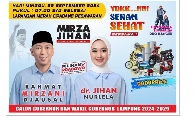 Pesawaran– Pasangan calon Gubernur dan Wakil Gubernur Lampung, Rahmat Mirzani Djausal dan dr. Jihan Nurlela, akan mengadakan acara Senam Sehat yang penuh semangat dan kegembiraan pada hari Minggu, 22 September 2024. Acara ini akan berlangsung di Lapangan Merah Cipadang, Pesawaran, mulai pukul 07.00 WIB hingga selesai.