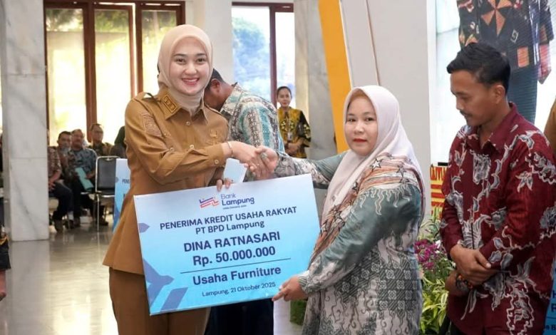 BANDAR LAMPUNG — Wakil Gubernur Lampung, Jihan Nurlela menyerahkan Kredit Usaha Rakyat (KUR) kepada empat perwakilan pelaku UMKM asal Lampung pada kegiatan Akad Massal KUR 800.000 Debitur untuk Penciptaan Lapangan Kerja dan Peluncuran Kredit Program Perumahan (KPP), di Mahan Agung, Bandar Lampung, Selasa (21/10/2025).